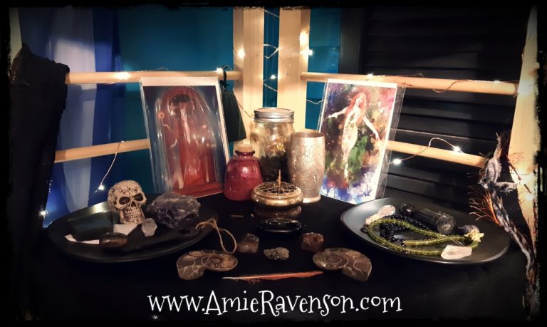 So there are a few different ways to go when choosing Samhain colors for your altar. You can go with the Halloweeny black and orange, and you’ll find lots of decorative pieces that will work with the scheme. You could also go for the less traditional, but popular lime green and purple and black. If you hail from Mexico, you could choose to go with Day of the Dead, which uses lots of bright, festive colors. Or you could do what I’m going to do, and go with black and grey and silver, somber smoke colors that represent the ancestors, with just a hint of bright colors here and there. You could also go with traditionally Autumnal colors, like reds and oranges and golds if you want to focus on the changing of the leaves. This is all really about what this sabbat means to you personally!