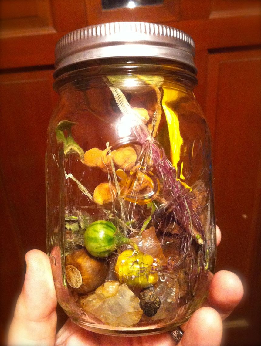 As we were getting ready to leave, I glanced around trying to find something to hold my acorns. Lo and behold, I found a small mason jar, and thought that would work just as a quick fix. Little did I know that I would need to choose a bigger jar when we got home because of all the goodies I found.