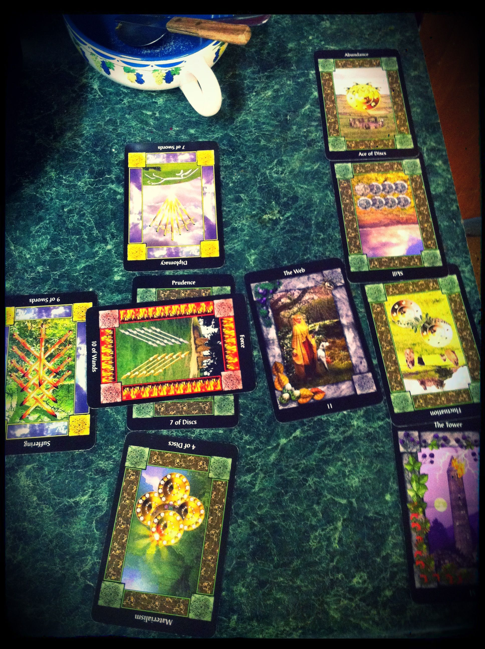 First Impressions: there are a LOT of Earth/Disc cards in this spread. So a lot of financial things happening. Fair enough, as that’s what I really asked about. Also, I DON’T like seeing The Tower anywhere in my spread, and it’s in the ‘near future’ spot. This doesn’t bode well. I feel like everything is about to cave in on me, and maybe it is. 🙁